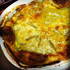 5. Bake in 425°F oven on baking sheet for 10 minutes, then cover lightly with aluminum foil and continue baking for another 30-35 minutes until the filling is bubbling and the pastry is brown and puffy.